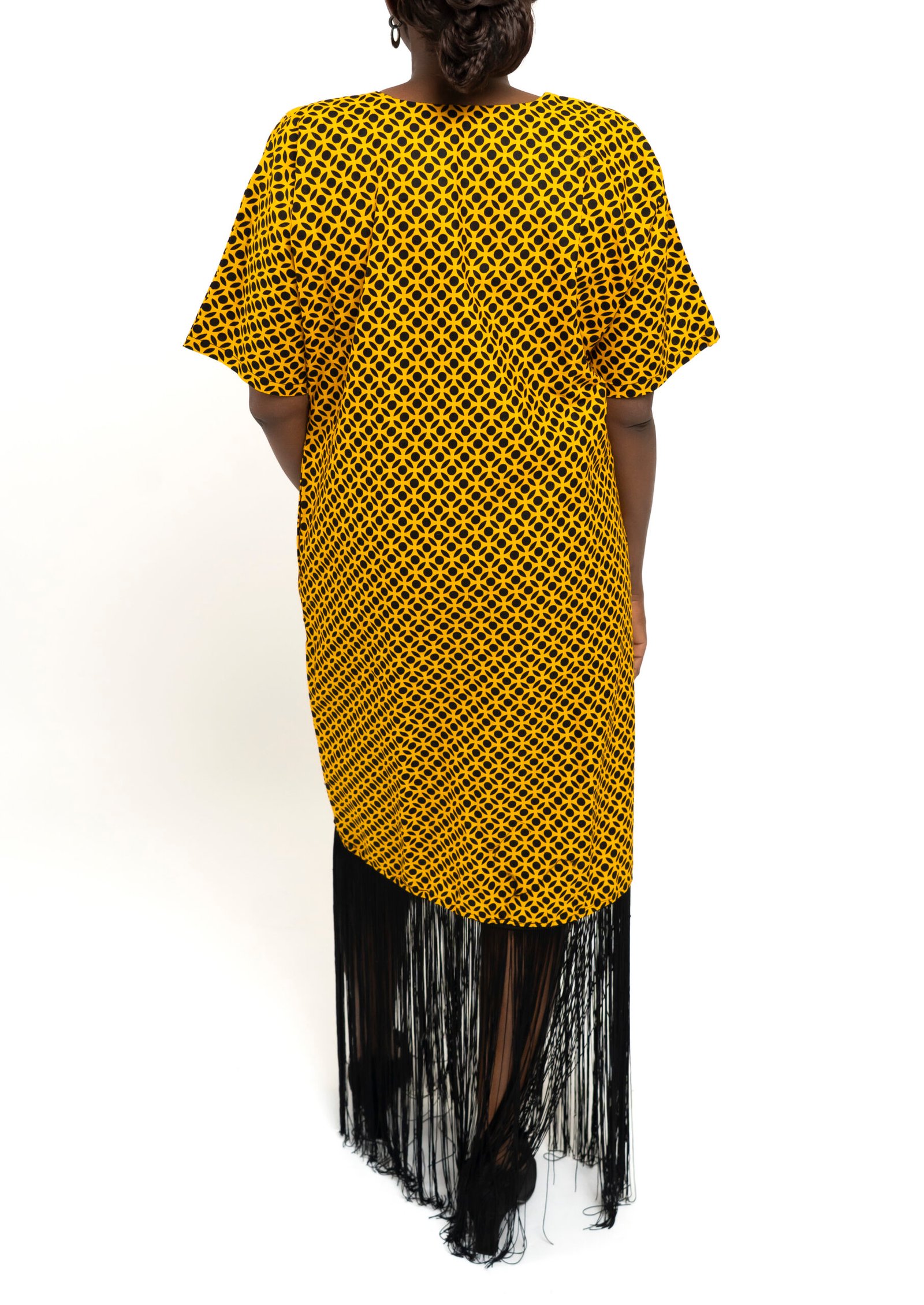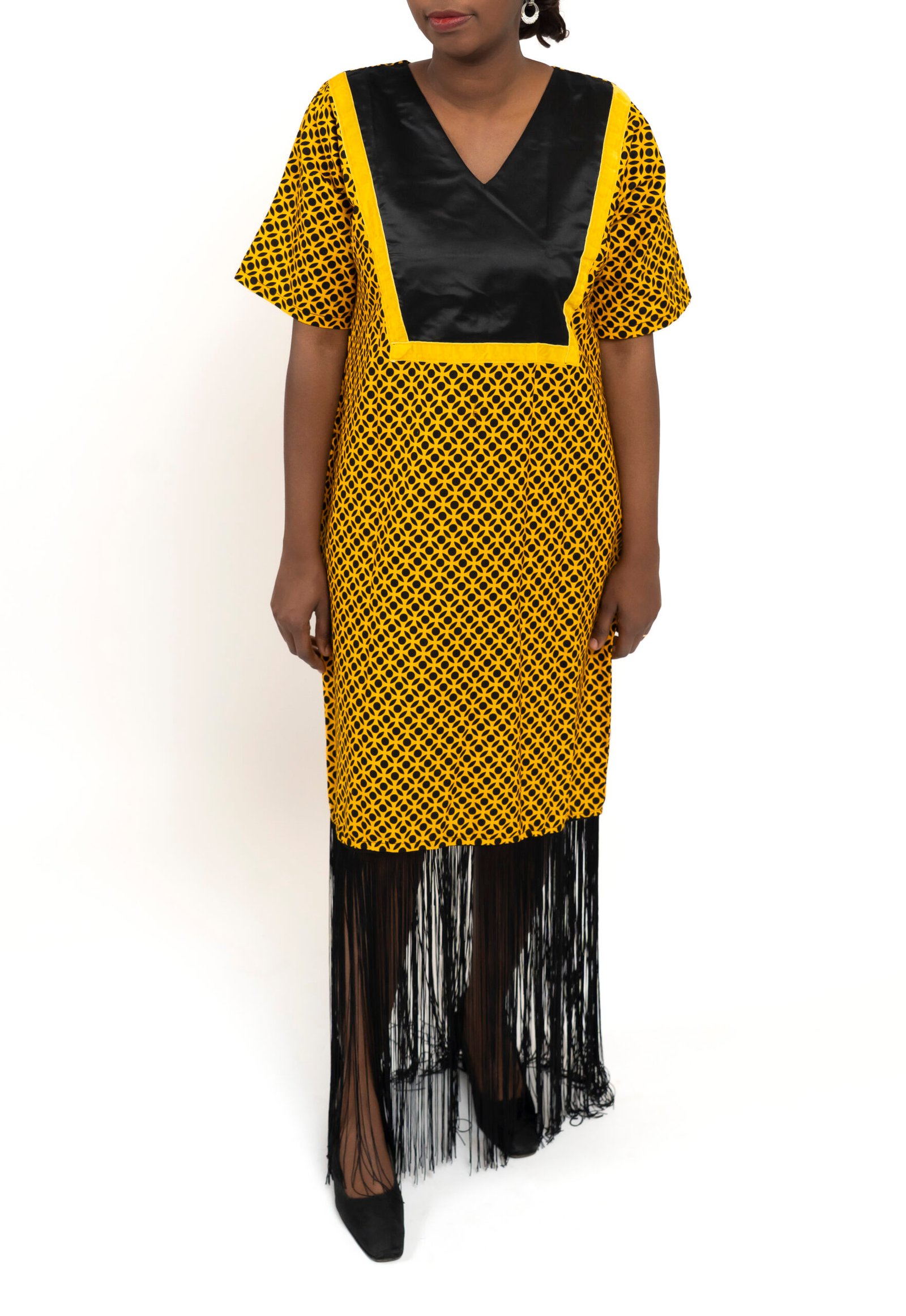 The Gimbiya Noir Gold Fringe Dress blends rich mustard Ankara with a striking black V-panel detail for a silhouette that commands attention without excess. The geometric print adds structure and rhythm, while the soft black fringe hem introduces movement and elegance.