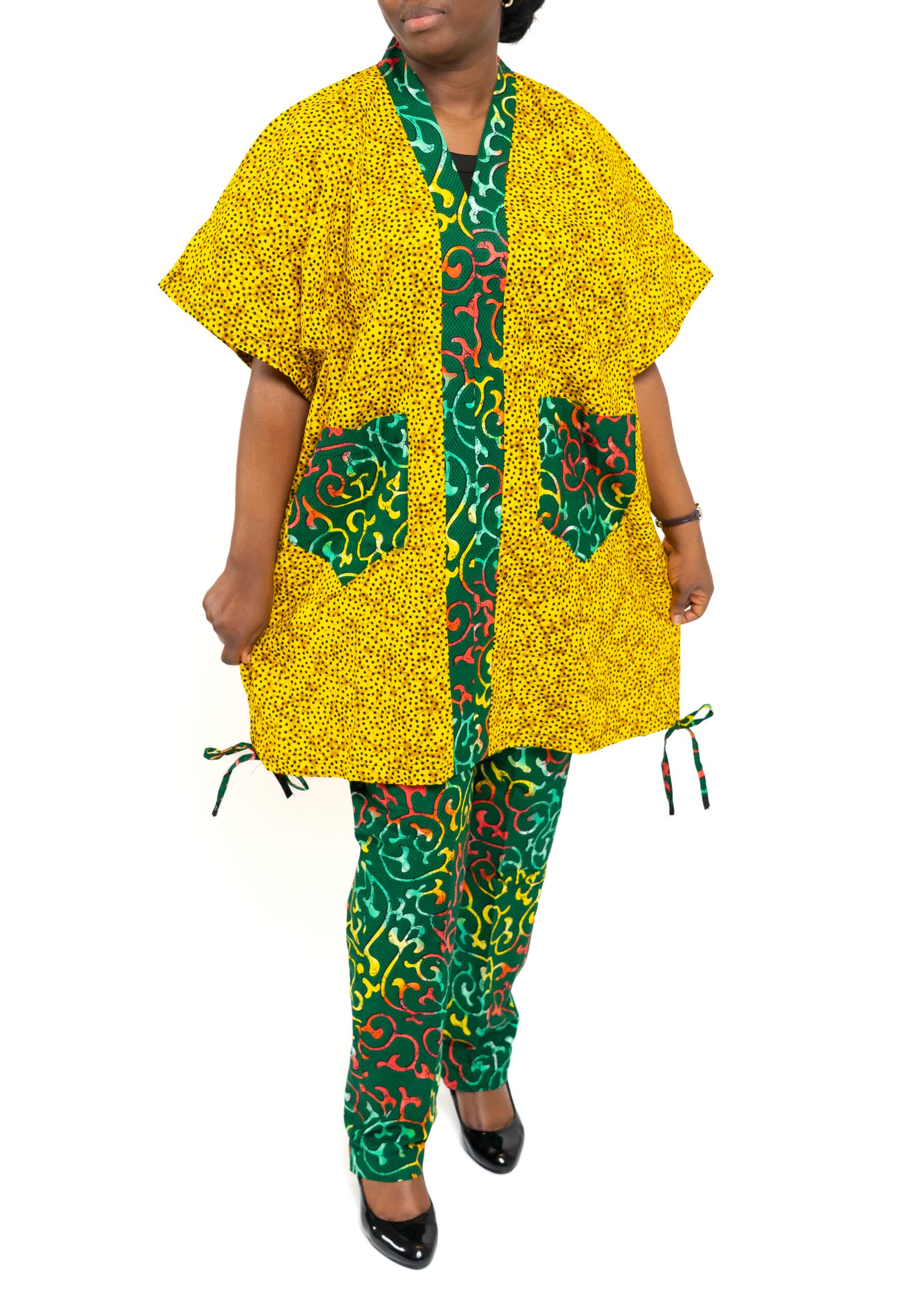 The Malika Royal Radiance Set is designed for women who carry presence wherever they go. Featuring a radiant golden Ankara tunic with rich green detailing and matching tailored trousers, this two-piece ensemble celebrates culture with confidence.